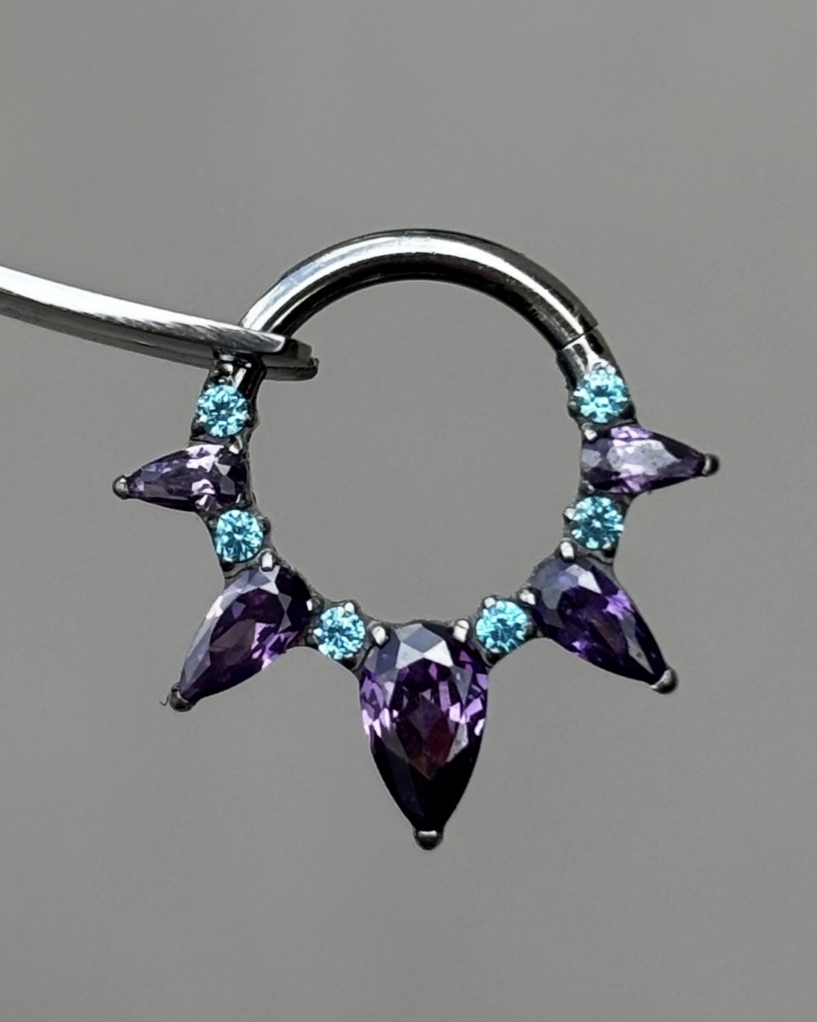una hermosa argolla aro saks con piedras color amatista y pequeñas zirconias redondas azules que hacen un contraste demasiado lindo para que luzca tan hermoso