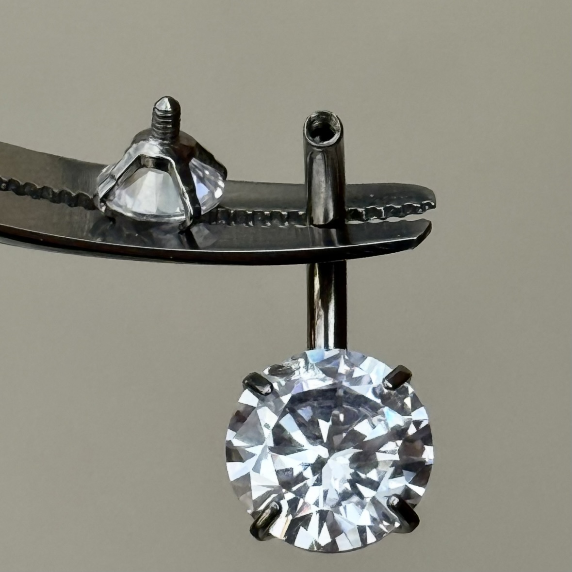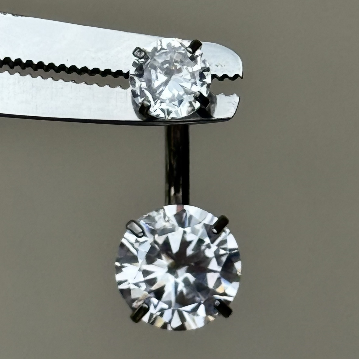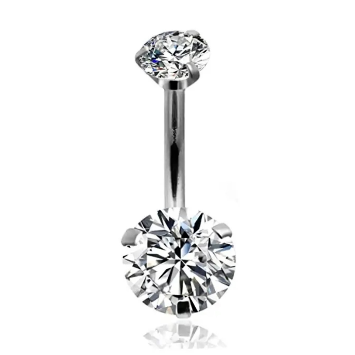 y se ve increíble!Una joya para ombligo en modelo clásico de dos zirconias redondas una grande y una pequeña con metal abrazando a una piedra